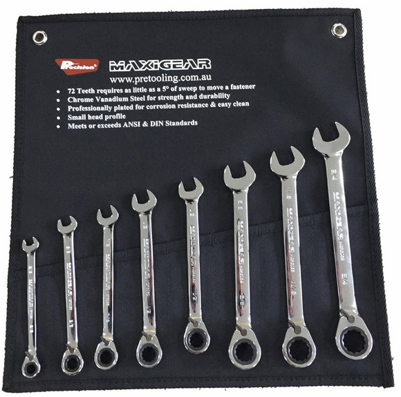- Wrench Ratcheting Reversible MAXIGEAR 8 pc set 5/16, 3/8, 7/16, 1/2, 9/16, 5/8, 11/16, 3/4 on a wrench rack