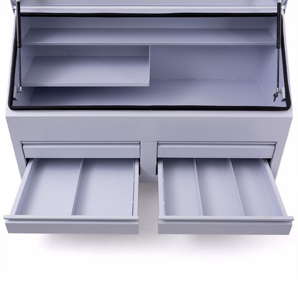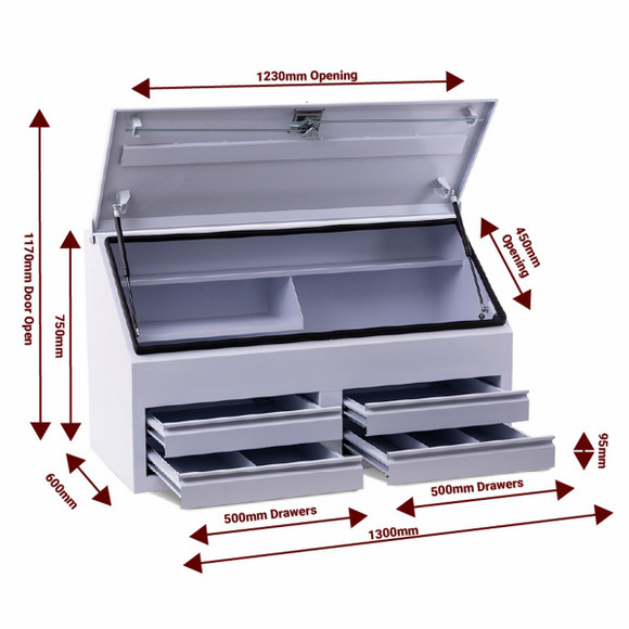 These 4 drawer steel truck boxes have a massive capacity and are made with solid steel to be the perfect addition to the professional tradesperson's work vehicle. They are fully seam-welded, powder coated inside and out and have internal gas struts which automatically open the lid for added convenience. A quality rubber seal keeps the elements out while two stainless steel 4 point t-locks keep people with sticky fingers out. Perfect for keeping your gear safe on-site and in transit!