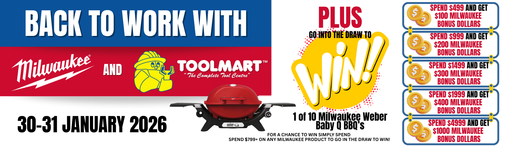 Milwaukee Bonus Dollars Voucher to be redeemed immediately following qualifying invoice payment on a separate sale invoice instore. No Bonus is payable on second invoice. Voucher valid for Milwaukee Tools only. Milwaukee Bonus Dollars for all qualifying online transactions will be issued as “Coupon Codes” and emailed to the registered email address within 3 business days of transaction. Milwaukee Coupon Codes must be redeemed in full within 48 hours from date of issue. Milwaukee Coupon Codes are only redeemable on Milwaukee products and must be fully redeemed in 1 transaction. All shipping costs are excluded from earning Bonus Dollars. There are no other spend tiers other than those stated in the promotion. Entry to the BBQ promotion is limited to WA residents and requires a minimum spend of $799 on Milwaukee branded products on a single invoice. Some exclusions apply – see T&C’s for details. Offer valid Friday 30/01/26 and Saturday 31/01/26. Promoter is Toolmart Australia Pty Ltd.